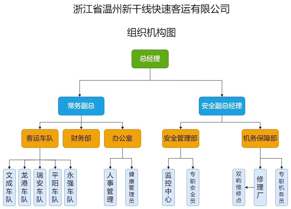 公司现有行政管理人员 21名,下设安全管理部、机务保障部、财务部、办公室、客运车队、监控中心、修理厂,其中专职安全管理员、监控管理员共6名。公司共有在职 A1 资质大客车驾驶员62名,均拥有6年以上驾龄,并未发生一般及以上责任安全事故。驾驶员都是经过层层筛选,经验丰富、技术过硬。